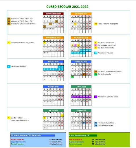 Los días festivos de ámbito nacional y autonómico serán los establecidos por el Consejo de Ministros y el Consejo de Gobierno de la Comunidad Autónoma de Andalucía, respectivamente. Además, se establece como día festivo el “Día de la Comunidad Educativa” para todos los niveles y miembros de la Comunidad Educativa el 25 de febrero de 2022